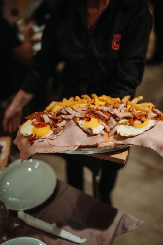 • Gallega: jamón cocido, cheddar, panceta, morrón y 3 huevos fritos.